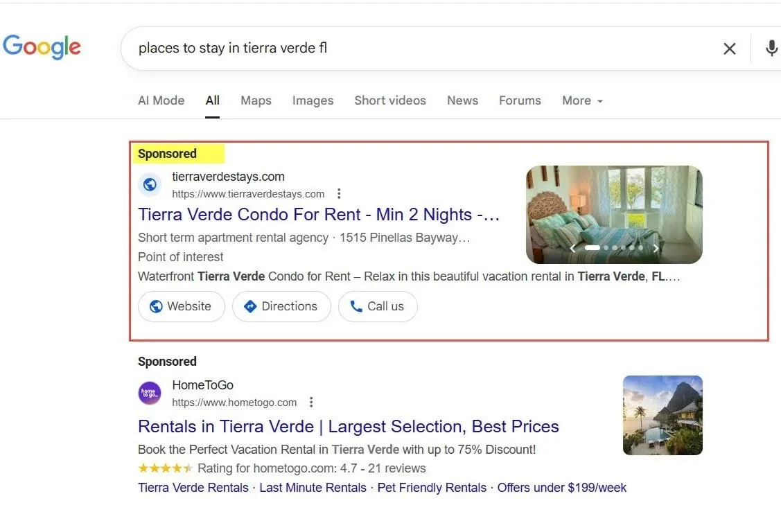 Tierra Verde Stays not only is one of the very few short term rental showing on a google search, but also placing on the first position for some specific search terms with results like the below:
